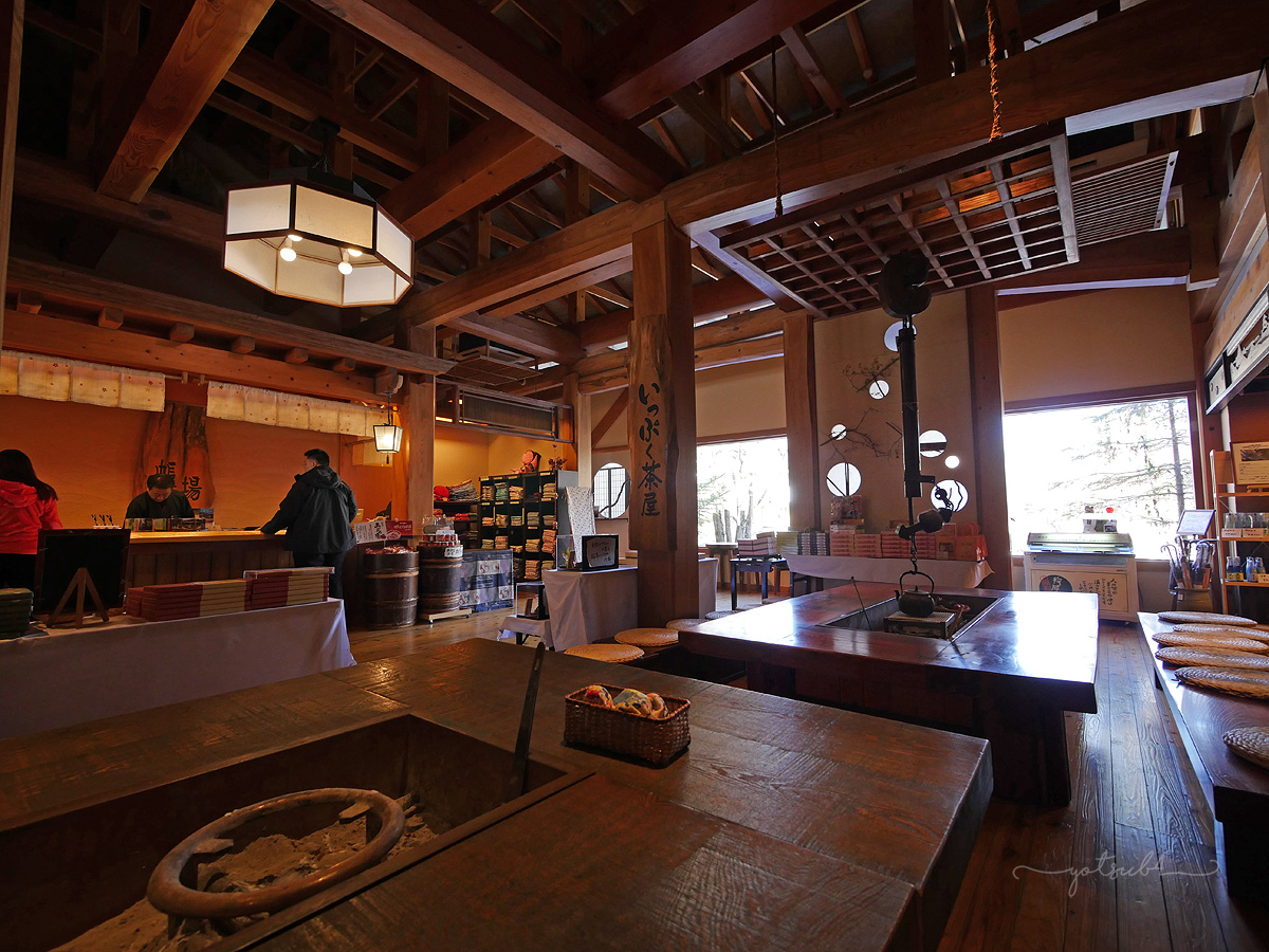 After breakfast we went down to the private-use rotenburo again. The experience felt somewhat different in the daytime, where we could actually see our surroundings. Surrounding the sides of the rotenburo was a high wooden fence, and one side overlooked the mountain valley. All we could see were the tree branches covered with snow. The stones and sasa plants around the rotenburo were all covered in clean, fluffy snow as well. While soaking, it started to snow lightly, and we watched the snow flakes drift down the open sky above, and disappear as they met the steam rising from the bath. It really quiet, with the occasional sound muffled by the snow.